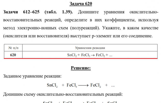 Задача 620 - Допишите уравнения окислительно-восстановительных реакций, определите в них коэффициенты, используя метод электронно-ионных схем (полуреакций). Укажите, в каком качестве (окислителя или восстановителя) выступает p-элемент или его соедине