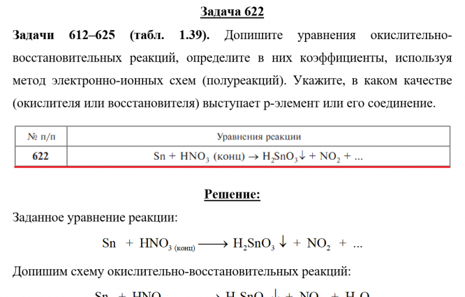 Задача 622 - Допишите уравнения окислительно-восстановительных реакций, определите в них коэффициенты, используя метод электронно-ионных схем (полуреакций). Укажите, в каком качестве (окислителя или восстановителя) выступает p-элемент или его соедине
