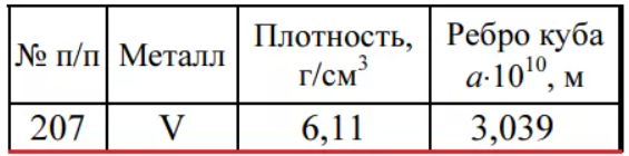 Задача 207: В задачах 206-225 определите, используя приведенные ниже экспериментальные данные, структурный тип кристаллической решетки, в которой кристаллизуется данный металл (гранецентрированная кубическая, объемно-центрированная кубическая или типа алмаза), рассчитайте эффективный радиус атома металла, изобразите элементарную ячейку, укажите координационное число.