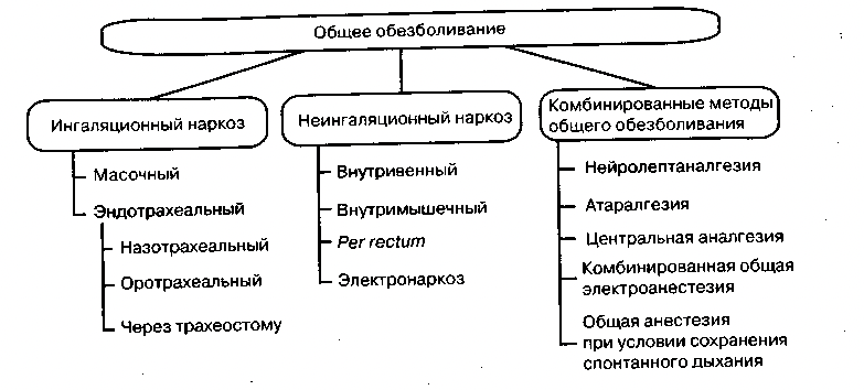 Состояние наркоза характеризуется обратимым угнетением ЦНС с выключением сознания, подавлением чувствительности (в первую очередь, болевой) и рефлекторных реакций, снижением тонуса скелетных мышц. Средства для наркоза угнетают межнейронную (синаптическую) передачу возбуждения в ЦНС. При этом нарушается передача афферентных импульсов, изменяются корково-подкорковые взаимоотношения, функция промежуточного, среднего, спинного мозга, что и обусловливает развитие наркоза. Синаптические образования разных уровней ЦНС и различной морфофункциональной организации неодинаково чувствительны к средствам для наркоза. Этим объясняется стадийность действия средств для наркоза.