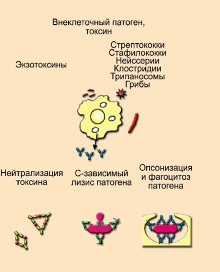 Антитела взаимодействуют с антигенами на поверхности внеклеточных патогенов. Антитела, направленные против жгутиковых антигенов, обездвиживают клетку. IgA-антитела, связывающиеся с бактериями в просвете кишечника, препятствуют их проникновению через кишечную стенку. Взаимодействуя с токсинами, антитела обычно вызывают их инактивацию. Таким образом, антитела сами по себе могут осуществлять защиту от внеклеточных бактерий и их токсинов.