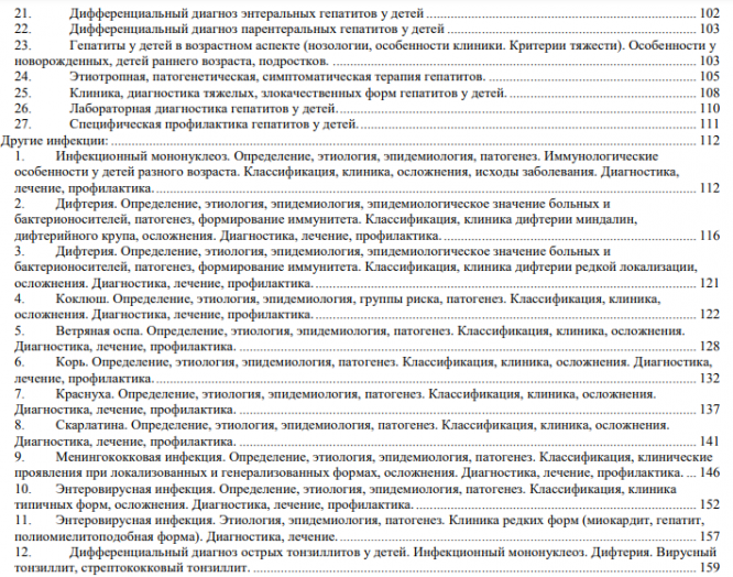 102 22. Дифференциальный диагноз парентеральных гепатитов у детей ........................................................................ 103 23. Гепатиты у детей в возрастном аспекте (нозологии, особенности клиники. Критерии тяжести). Особенности у новорожденных, детей раннего возраста, подростков. ......................................................................................................... 103 24. Этиотропная, патогенетическая, симптоматическая терапия гепатитов. ............................................................ 105 25. Клиника, диагностика тяжелых, злокачественных форм гепатитов у детей. ...............