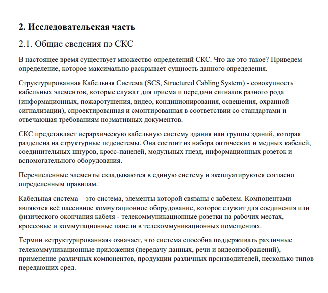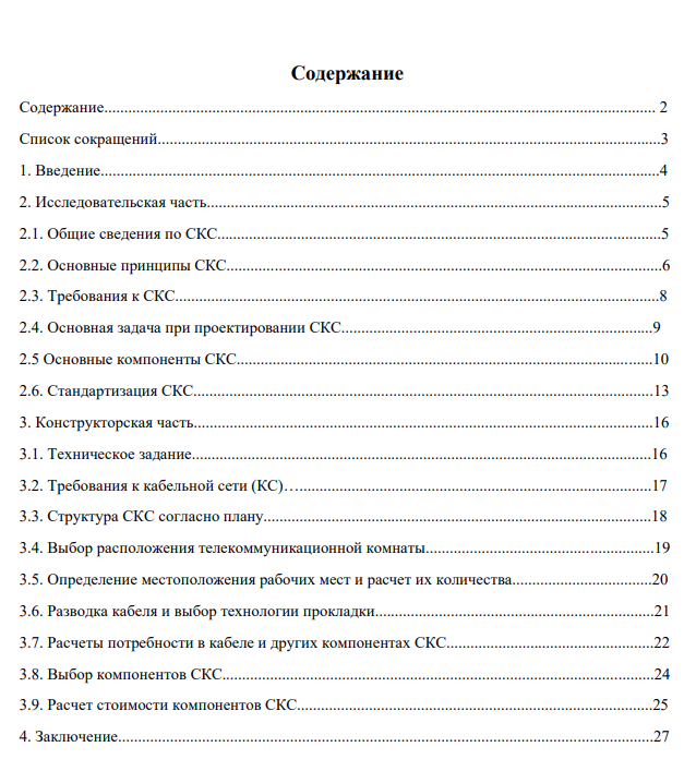В настоящее время структурированная кабельная система (СКС) занимает одно из самых важных мест в информационной сфере. Она проектируется с учетом пожеланий заказчика и необходимых требований по условиям эксплуатации и скорости передачи данных. Правильно спроектированная и смонтированная СКС позволяет значительно упростить организацию и размещение рабочих мест в офисе, полностью решить вопрос взаимозаменяемости кабельных сетей (включая замену и добавление оборудования), повысить эффективность работы персонала, сэкономить средства при перепланировке рабочих мест. Ценность и актуальность СКС состоит в обеспечении универсального независимого сервиса и подключения любого стандартного сетевого оборудования. На сегодняшний день СКС является необходимым атрибутом каждого офисного, жилого и производственного здания и обеспечивает работоспособность, связывая воедино сетевое оборудование. Основная задача СКС — удовлетворение потребностей всех потенциальных пользователей системы на весь срок существования здания без переделки или расширения кабельной системы. Цель курсового проекта: в соответствии с выданным архитектурным планом разработать структурированную кабельную систему, отвечающую основным принятым стандартами. Задачи курсового проекта: ознакомиться с основными теоретическими сведениями о структурированных кабельных системах; выбрать стандарт, на основе которого будут осуществляться вычисления; изучить архитектурный план и выбрать расположение телекоммуникационной комнаты; определить местоположения рабочих мест и рассчитать их количество; сделать разводку кабеля на архитектурном плане; выбрать необходимые компоненты СКС и рассчитать их стоимость.