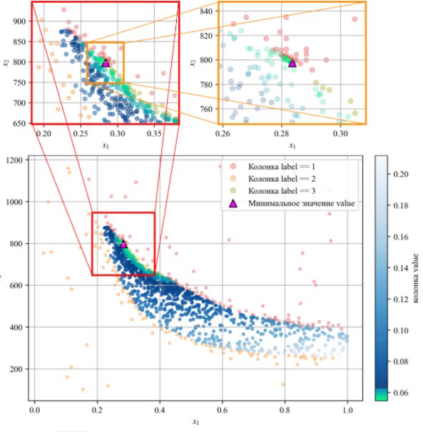: x1, x2, label, value. Необходимо нанести эти данные на график и выделить цветом данные, в зависимости от значения label: для каждого значения label (кроме 0) нужен отдельный цвет (см. рис. 1).
