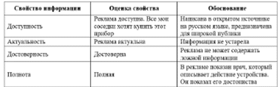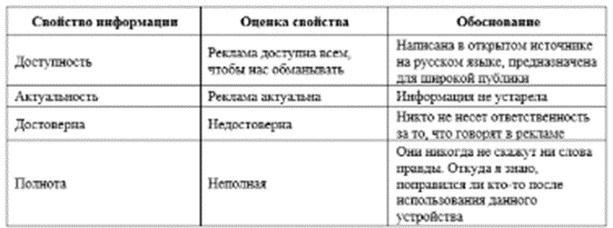 Гражданка Р. услышала по ТВ рекламу нового устройства от болей в пояснице. После этого она решила потратить на его приобретение отложенные на отпуск деньги. Оцените разумность ее поступка, основываясь на ее оценке свойств полученной информации.