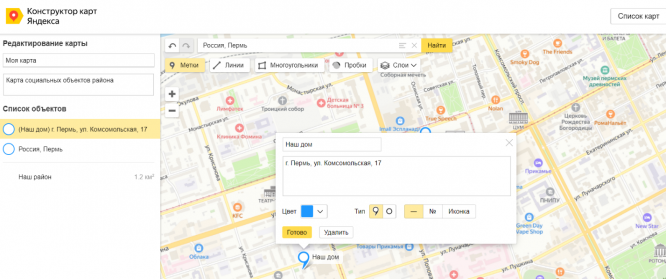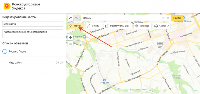 Аналогично выбрать инструмент «Метки», поставить метку в нужном месте и настроить ее, это будет указание на социальную организацию. Теперь создать вторую метку, выбрав для нее другой, чтобы различать.