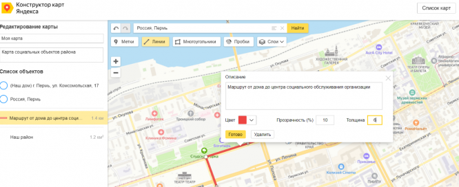 Нужно указать путь от социальной организации до нашего дома. Найдите нужную организацию на карте, затем выберите инструмент «Линии», нарисуйте путь мышкой. Затем настройте внешний вид линии: толщину, прозрачность, цвет. Конструктор сразу подсчитает, сколько метров нужно пройти: