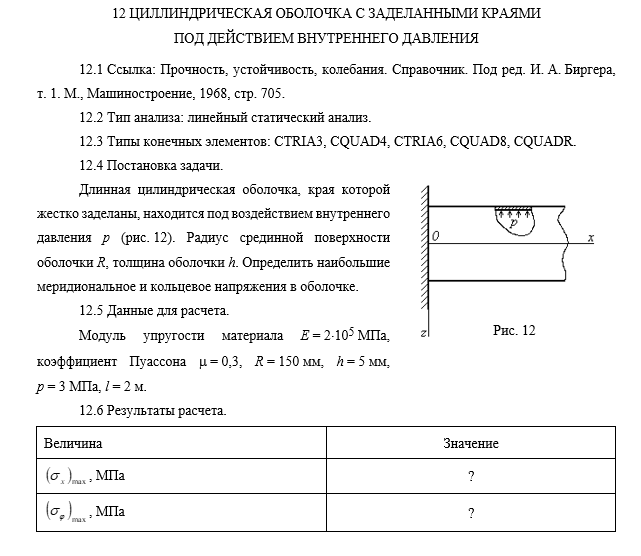 ДЗ 1: Цилиндрическая оболочка с заделанными краями под действием внутреннего давления. С расчетами из Femap. вариант 12