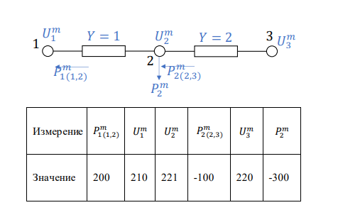 Дана модель сети постоянного тока и измерения. Требуется решить задачу оценивания состояния для данной сети, предполагая, что все измерения мощностей имеют весовой коэффициент 0.1, а измерения напряжений 1 (измерения напряжений точнее в 10 раз). Выполнить 2 итерации методом Гаусса-Ньютона и 2 итерации обобщенным методом Ньютона. Для начального приближения и для каждой итерации показать значения базисных параметров состояния и целевой функции.