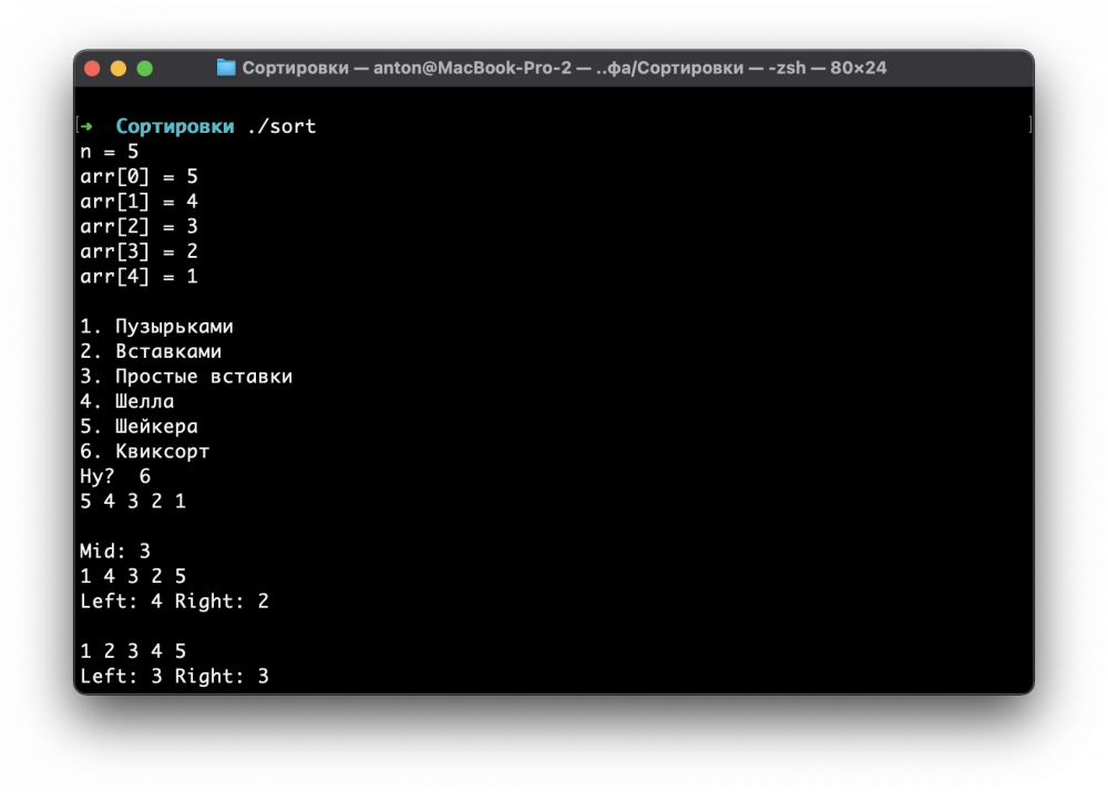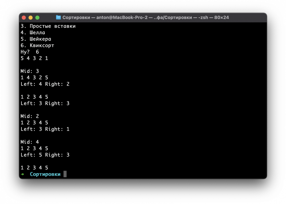 После выполнения выводится каждый шаг итерации(Примечание: Квиксорт берет серединный элемент как опорный)