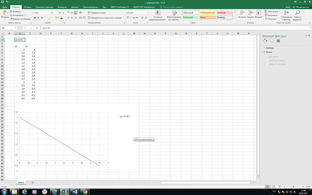 2. Запускаем Microsoft Office Excel. Составляем таблицу значений для первого уравнения. Для этого создаём столбец с произвольным значением для X1 методом «протягивания» ячеек, а для столбца значений X2 задаём формулу.