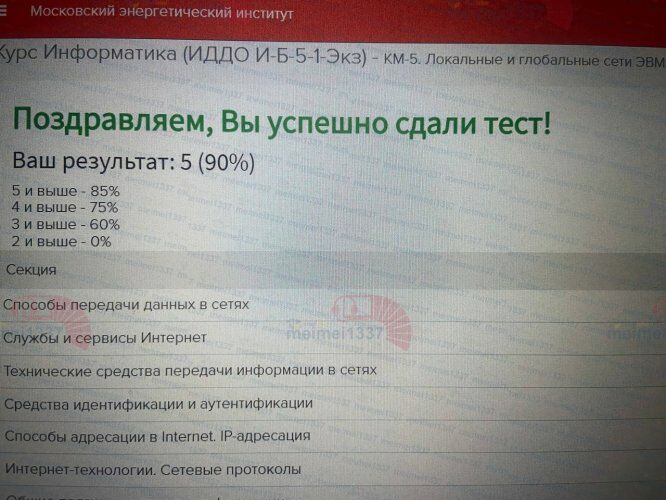 Для студентов ИДДО НИУ «МЭИ» по предмету ИнформатикаКМ-5. Локальные и глобальные сети ЭВМ. Основы инофрмационной безопасности. Тестирование - 90%КМ-5. Локальные и глобальные сети ЭВМ. Основы инофрмационной безопасности. Тестирование - 90%