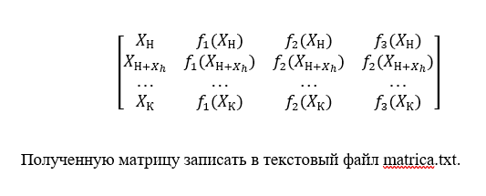 6. Считать одномерные массивы из файлов: function_1.txt, function_2.txt, function_3.txt, а также значения аргумента из файла tablica.txt и сформировать матрицу , следующего вида: