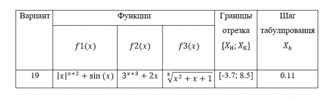 1. Для заданных в таблице 1.1 функций рассчитать значения на интервале с шагом . Изменение аргумента и результаты расчета записать в текстовый файл tablica.txt и сделать вывод этих результатов на экран консоли. Границы интервала и шаг изменения аргумента ввести с клавиатуры. Запись в файл оформить в виде процедуры.