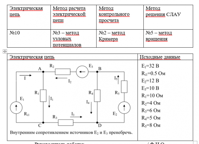 Задание. Выполнить расчет тока в электрической цепи. Для решения системы линейных алгебраических уравнений, полученной в результате расчета цепи составить блок-схему алгоритма и программу на языке С++. Выполнить контрольный просчет с помощью редактора электронных таблиц MS Excel.