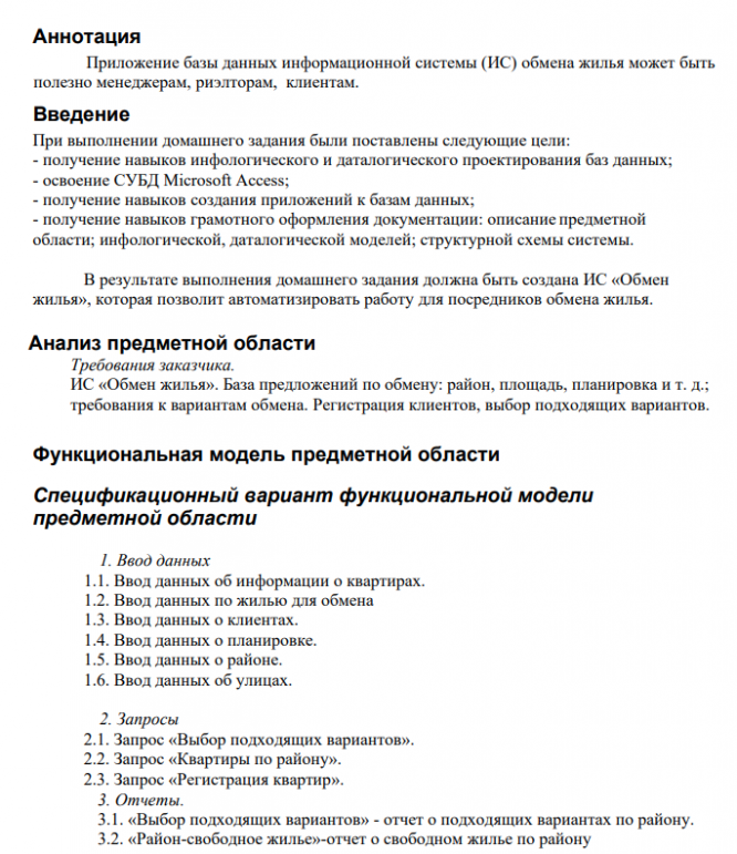 При выполнении домашнего задания были поставлены следующие цели: - получение навыков инфологического и даталогического проектирования баз данных; - освоение СУБД Microsoft Access; - получение навыков создания приложений к базам данных; - получение навыков грамотного оформления документации: описание предметной области; инфологической, даталогической моделей; структурной схемы системы. В результате выполнения домашнего задания должна быть создана ИС «Обмен