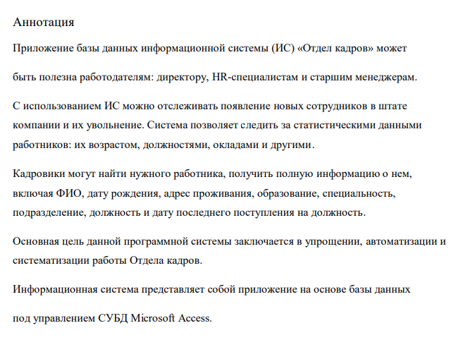 Приложение базы данных информационной системы (ИС) «Отдел кадров» может быть полезна работодателям: директору, HR-специалистам и старшим менеджерам. С использованием ИС можно отслеживать появление новых сотрудников в штате компании и их увольнение. Система позволяет следить за статистическими данными работников: их возрастом, должностями, окладами и другими.