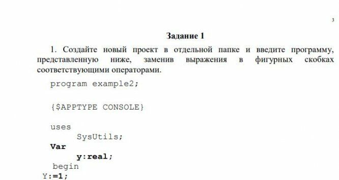 Задание 1 1. Создайте новый проект в отдельной папке и введите программу, представленную ниже, заменив выражения в фигурных скобках соответствующими операторами.