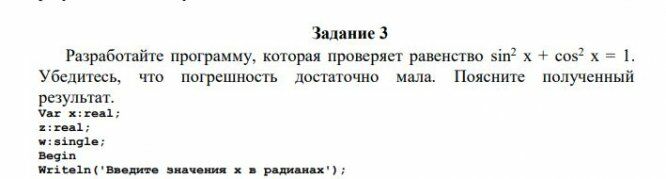 Задание 3 Разработайте программу, которая проверяет равенство sin2 x + cos2 x = 1. Убедитесь, что погрешность достаточно мала. Поясните полученный результат.
