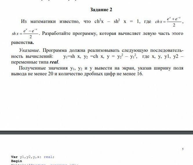 Задание 2 Из математики известно, что ch2x – sh2 x = 1, где 2 x x e e ch x , 2 x x e e sh x . Разработайте программy, которая вычисляет левую часть этого равенства