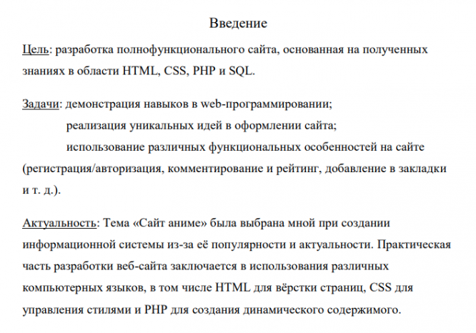 Разработка данного сайта производилась с использованием языка гипертекстовой разметки (HTML), каскадных таблиц стилей (CSS), скриптового языка программирования PHP и системы управления реляционными базами данных MySQL. В процессе разработки веб-сайта был создан дизайн, определена целевая аудитория и также были придуманы дополнительные функции. Максимальное удобство и простата была разработана для восприятия пользователем всей динамики и погружения в мир аниме благодаря многофункциональности языков для веб-разработки.
