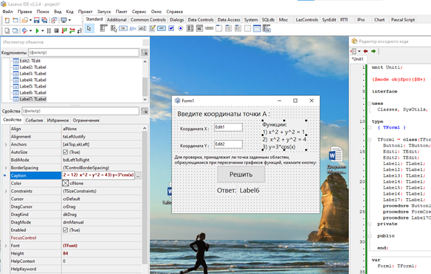 Результат проверки отображается на экране в метке Label6. Код: unit Unit1; {$mode objfpc}{$H+} interface uses Домашняя работа. ЛР Задача из ДЗ на оператор условия / задача из РК программа в Pascal Lazarus. В архиве также файл с объяснениями работы программы. Тэги: Программа на Lazarus, PascalObject, Pascal, Delphi, Turbo Delphi, Pascal ABC / Анимация, ЛР, РК, ДЗ, 2023 Условия для программы, под которые она выполнена: Проверить принадлежит ли точка заданной области включая границы (заштрихованные области на фото). Функции: 1) x^2 + y^2 = 1 2) x^2 + y^2 = 4 3) y=3*cos(x) Программа в сделанном ввиде: .