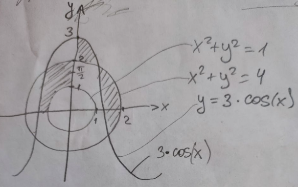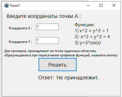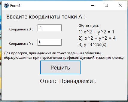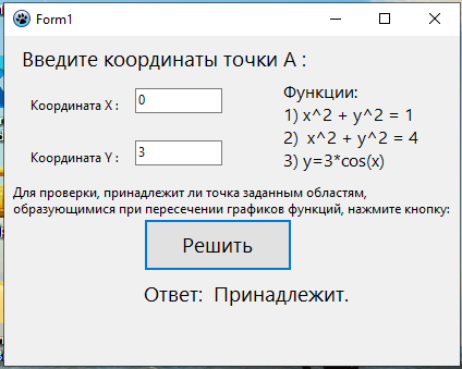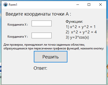 Проверить принадлежит ли точка заданной области включая границы (заштрихованные области на фото). Функции: 1) x^2 + y^2 = 1 2) x^2 + y^2 = 4 3) y=3*cos(x) 1. Создается графическое окно с формой, содержащей элементы управления: два поля ввода (Edit1 и Edit2) для ввода координат, одну кнопку (Button1) для выполнения проверки, и несколько меток (Label1, Label2, ..., Label7) для отображения различных текстовых сообщений. 2. При запуске программы вызывается процедура FormCreate, которая выполняет следующие действия: · Очищает содержимое поля ввода Edit1. · Очищает содержимое поля ввода Edit2. · Очищает метку Label6.Caption, которая будет использоваться для вывода результата.