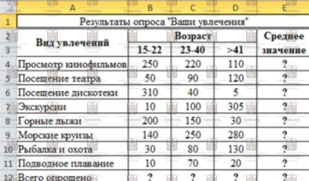 Для этого установите курсор в ячейку G14 и выполните двойной щелчок левой кнопкой мыши по кнопке ∑ Автосумма. Произойдет сложение данных колонки «G». 1. Произведите обрамление таблицы. Для этого выделите блок ячеек таблицы, начиная от верхнего левого или от нижнего правого угла таблицы и нажмите кнопку «Все границы» меню Главная / Шрифт. 2. Сохраните файл под именем «Задание №3». Задание 4. Создайте таблицу анализа результатов опроса. Произведите все расчеты по заданию. Постройте круговую диаграмму среднего значения числа опрошенных по видам увлечений. Произведите форматирование диаграммы. Исходные данные представлены на рисунке 8. 1. Запустите редактор электронных таблиц Microsoft Excel.