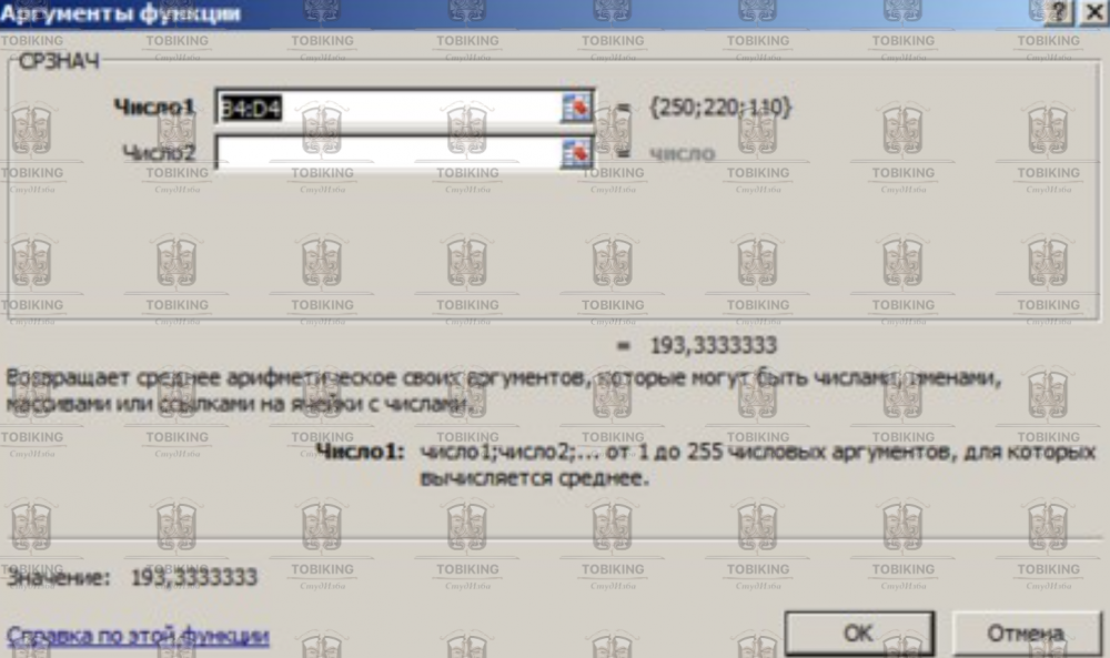 После нажатия на кнопку ОК откроется окно для выбора диапазона данных для вычисления заданной функции. В качестве первого числа выделите группу ячеек с данными для расчета среднего значения В4:D4 и нажмите кнопку ОК (Рисунок 10 ). В ячейке E4 появится среднее значение данных строки 4.
