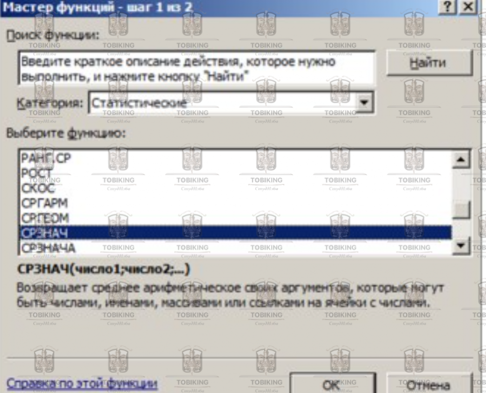 2. Рассчитайте средние значения по строкам, пользуясь мастером функций f . Функция СРЗНАЧ находится в разделе «Статистические». Для расчета функции среднего значения установите курсор в соответствующей ячейке для расчета среднего значения (Е4), запустите мастер функций (Формулы / Вставить функцию) и на первом шаге мастера выберите функцию СРЗНАЧ (категория Статистические / СРЗНАЧ) (Рисунок 9).