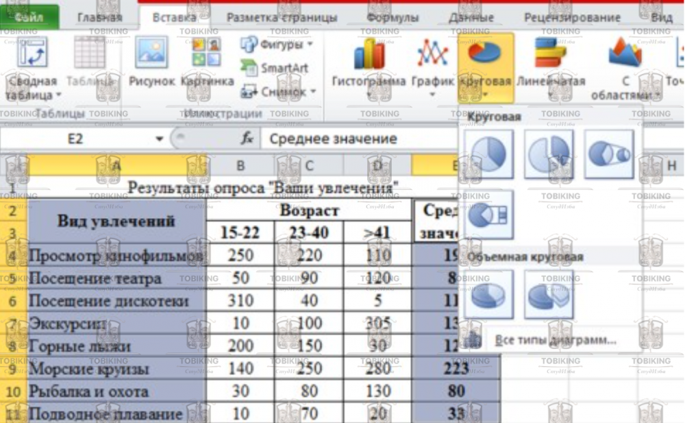 2. Выделите столбцы Вид увлечений и Среднее значение, содержащие исходные данные вместе с заголовками столбцов. Строку «Всего опрошено» в выделение не включа