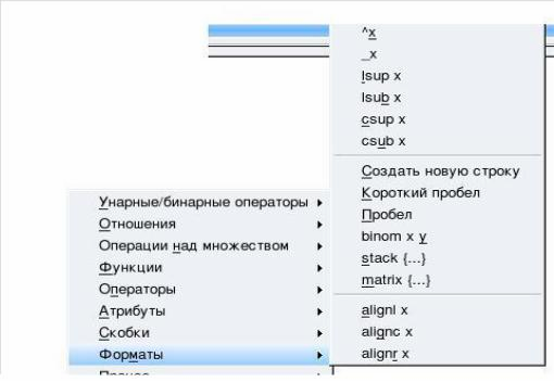 Категория Функции содержит обозначения: модуля; квадратного корня (sqrt x) и корня n-ой степени (nroot x, y); логарифмов экспоненты и прочее. Категория Операторы содержит обозначения: предела (lim); суммы (sum); произведения (prod); интегралов различной сложности (int, iint); и прочее. Категория Скобки содержит обозначения скобок различных видов. Категория Атрибуты содержит обозначения типа À, É, Õ, Û и прочее. Категория Форматы содержит обозначения: матрицы степени позволяет делать пробелы или создавать новую строку в формуле. Категория Прочее содержит обозначения: бесконечности (infinity); букв греческого алфавита (nabla, exists); стрелок(leftarrow, rightarrow) и многоточий (dotslow).