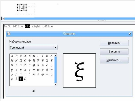Для того, чтобы набрать символы формулы необходимо из контекстного меню выбрать категорию и операцию, а затем в появившемся шаблоне значки заменить на необходимые цифры или символы (рисунок 8). Для того, чтобы завершить набор формулы необходимо щелкнуть вне окна для набора формулы. Для того, чтобы внести в формулу изменения необходимо произвести по ней двойной щелок левой кнопки мыши. Существуют дополнительные символы, которые также можно использовать при наборе формул. Для того, чтобы открыть окно с дополнительными символами, необходимо, не выходя из окна для набора формул, выбрать категорию главного меню Сервис, команду Каталог. В появившемся окне Символы из набора символов (греческий, специальный) необходимо выбрать нужный символ и нажать кнопку Вставить(рисунок 9).