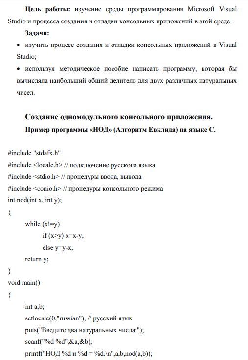 Задачи: изучить процесс создания и отладки консольных приложений в Visual Studio; используя методическое пособие написать программу, которая бы вычисляла наибольший общий делитель для двух различных натуральных чисел