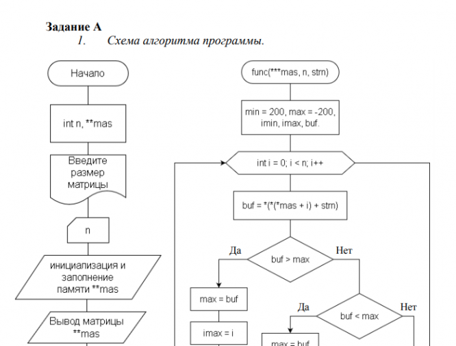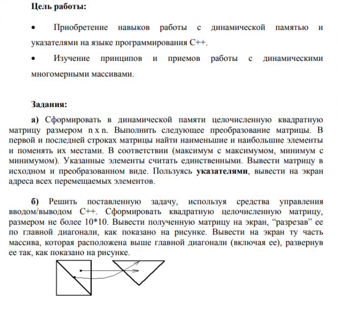 Задания:а)Сформировать в динамической памяти целочисленную квадратную матрицу размером nxn. Выполнитьследующее преобразование матрицы. В первой и последней строках матрицы найти наименьшие и наибольшие элементы и поменять их местами. В соответствии (максимум с максимумом, минимум с минимумом). Указанные элементы считать единственными. Вывести матрицу в исходном и преобразованном виде. Пользуясь указателями, вывести на экран адреса всех перемещаемых элементов. б)Решить поставленную задачу, используя средства управления вводом/выводом С++. Сформировать квадратную целочисленную матрицу, размером не более 10*10. Вывести полученную матрицу на экран, “разрезав” ее по главной диагонали, как показано на рисунке. Вывести на экран ту часть массива, которая расположена выше главной диагонали (включая ее), развернув ее так, как показано на рисунке.