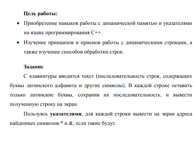 С клавиатуры вводится текст (последовательность строк, содержащих буквы латинского алфавита и другие символы). В каждой строке оставить только латинские буквы, сохранив их последовательность, и вывести полученную строку на экран.Пользуясь указателями, для каждой строки вывести на экран адреса найденных символов * и &, если такие будут.