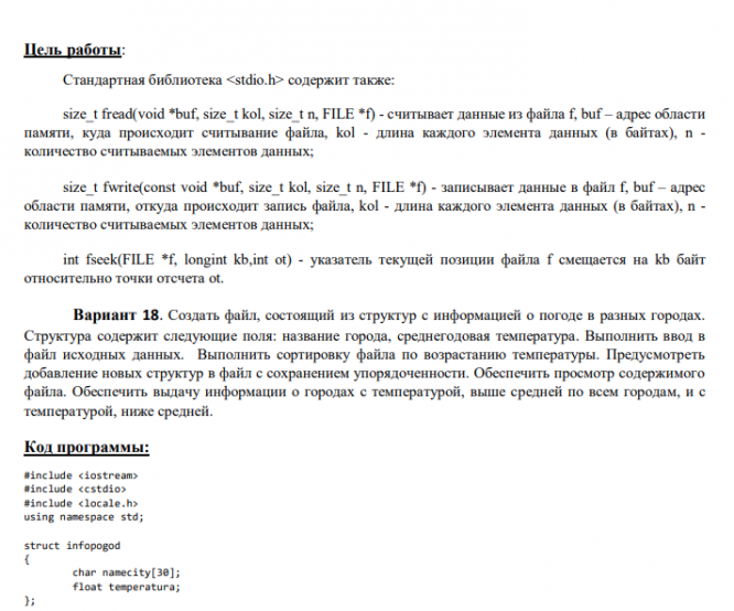 Вариант 18. Создать файл, состоящий из структур с информацией о погоде в разных городах. Структура содержит следующие поля: название города, среднегодовая температура. Выполнить ввод в файл исходных данных. Выполнить сортировку файла по возрастанию температуры. Предусмотреть добавление новых структур в файл с сохранением упорядоченности. Обеспечить просмотр содержимого файла. Обеспечить выдачу информации о городах с температурой, выше средней по всем городам, и с температурой, ниже средней. ![]()