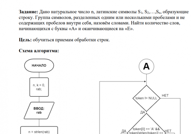 Задание: Дано натуральное число n, латинские символы S1, S2,…,Sn, образующие строку. Группа символов, разделенных одним или несколькими пробелами и не содержащих пробелов внутри себя, назовём словами. Найти количество слов, начинающихся с буквы «A» и оканчивающиеся на «E». Цель: обучиться приемам обработки строк.