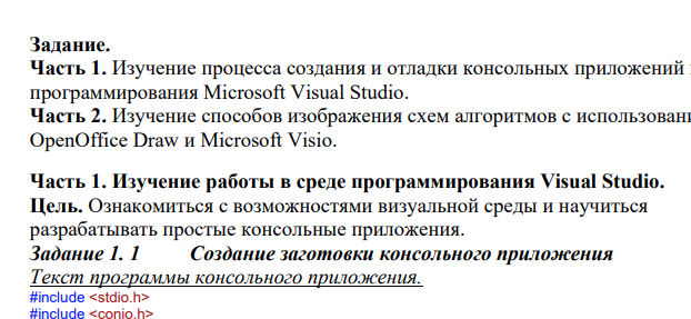 Задание.Часть 1. Изучение процесса создания и отладки консольных приложений в среде программирования Microsoft Visual Studio.Часть 2. Изучение способов изображения схем алгоритмов с использованием OpenOffice Draw и Microsoft Visio