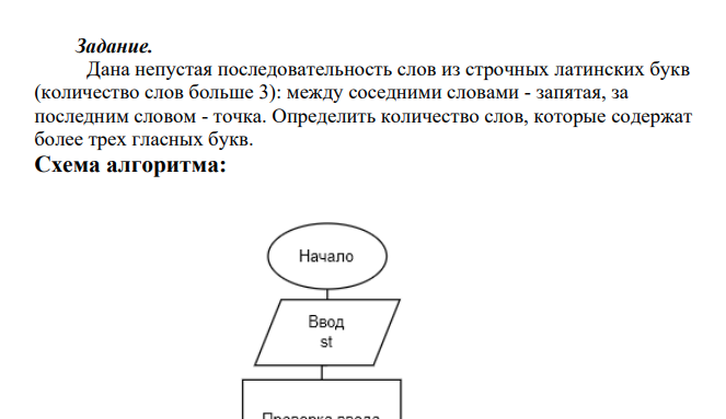 Задание.Дана непустая последовательность слов из строчныхлатинскихбукв (количество слов больше 3): между соседними словами -запятая, за последним словом -точка. Определить количество слов, которыесодержат более трех гласных букв