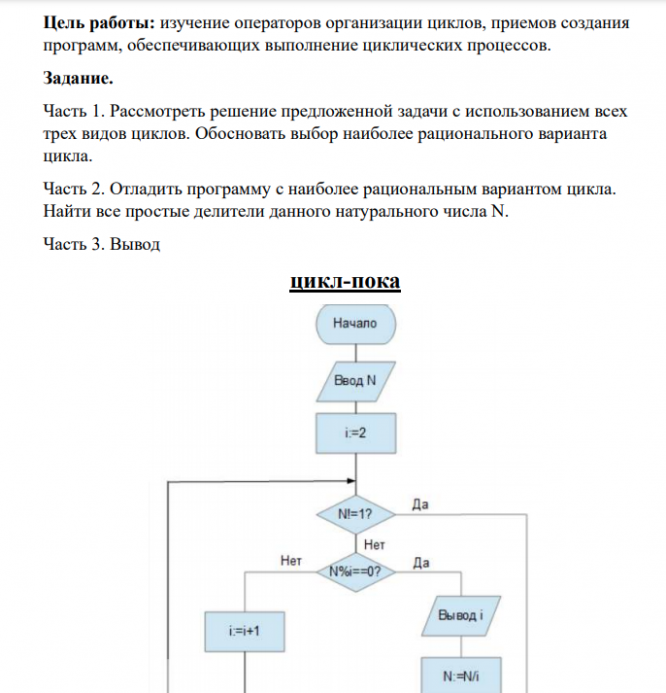 Рассмотреть решение предложеннойзадачи с использованием всех трех видов циклов. Обосновать выборнаиболее рациональноговариантацикла.Часть 2. Отладить программу с наиболее рациональным вариантом цикла. Найти все простые делители данного натурального ч