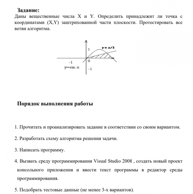 Задание:Даны вещественные числа X и Y. Определить принадлежит ли точка скоординатами (X,Y) заштрихованной части плоскости. Протестировать всеветви алгоритма.