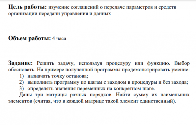 Задание: Решить задачу, используя процедуру или функцию. Выбор обосновать. На примере полученной программы продемонстрировать умение: 1) назначать точку останова; 2) выполнить программу по шагам с заходом в процедуры и без захода; 3) определять значения переменных на конкретном шаге. Даны три матрицы разных порядков. Найти сумму их наименьших элементов (считая, что в каждой матрице такой элемент единственный).