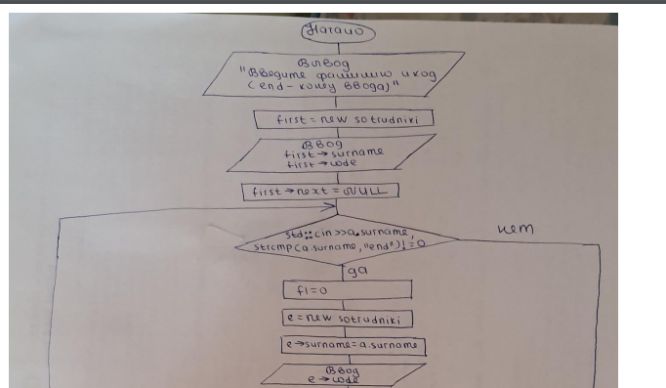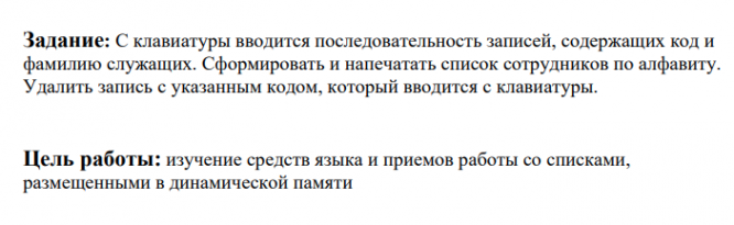 Задание: С клавиатуры вводится последовательность записей, содержащих код и фамилию служащих. Сформировать и напечатать список сотрудников по алфавиту. Удалить запись с указанным кодом, который вводится с клавиатуры. Цель работы: изучение средств языка и приемов работы со списками, размещенными в динамической памяти
