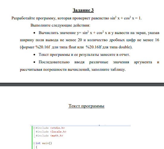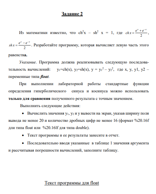 Цель: Целью данной лабораторной работы является знакомство студентов с погрешностями вычислений, которые возникают при решении различных задач на ЭВМ, и экспериментальная проверка на примерах некоторых вычислений возникновения и оценки таких погрешностей. Анализ зависимости погрешности от разрядности процессора вычислительной машины и типов данных, применяемых в языке программирования С++.