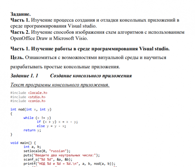 Задание. Часть 1. Изучение процесса создания и отладки консольных приложений в среде программирования Visual studio. Часть 2. Изучение способов изображения схем алгоритмов с использованием OpenOffice Draw и Microsoft Visio.