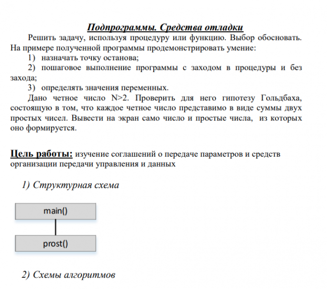 Подпрограммы. Средства отладки Решить задачу, используя процедуру или функцию. Выбор обосновать. На примере полученной программы продемонстрировать умение: 1) назначать точку останова; 2) пошаговое выполнение программы с заходом в процедуры и без захода; 3) определять значения переменных. Дано четное число N>2. Проверить для него гипотезу Гольдбаха, состоящую в том, что каждое четное число представимо в виде суммы двух простых чисел. Вывести на экран само число и простые числа, из которых оно формируется.