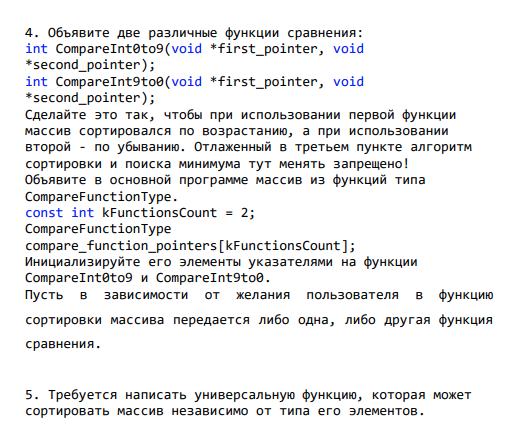 4. Объявите две различные функции сравнения: int CompareInt0to9(void *first_pointer, void *second_pointer); int CompareInt9to0(void *first_pointer, void *second_pointer); Сделайте это так, чтобы при использовании первой функции массив сортировался по возрастанию, а при использовании второй - по убыванию. Отлаженный в третьем пункте алгоритм сортировки и поиска минимума тут менять запрещено! Объявите в основной программе массив из функций типа CompareFunctionType. const int kFunctionsCount = 2; CompareFunctionType compare_function_pointers[kFunctionsCount]; Инициализируйте его элементы указателями на функции CompareInt0to9 и CompareInt9to0. Пусть в зависимости от желания пользователя в функцию сортировки массива передается либо одна, либо другая функция сравнения.
