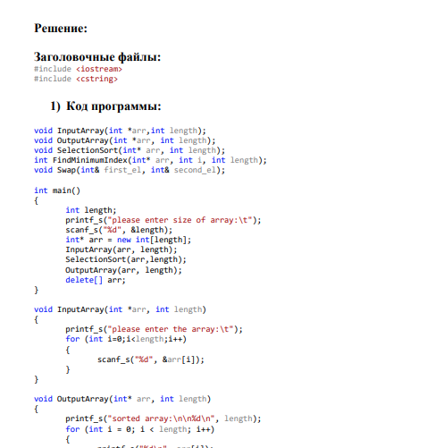 1. Напишите программу сортировки массива из N (1..10 000) целых чисел из диапазона -1 000 000 до +1 000 000 по возрастанию. (Используйте алгоритм сортировки выбором минимального элемента). В отдельной функции организуйте ввод элементов массива: void InputArray(int input_data[], int length); В отдельной функции организуйте поиск индекса минимального элемента на подмассиве: int FindMinimumIndex(int input_data[], int first_index, int last_index); В отдельной функции реализуйте обмен элементов массива. void Swap(int &first_element, int &second_element); В отдельной функции организуйте сортировку. void SelectionSort(int input_data[], int length); В отдельной функции организуйте вывод элементов упорядоченного массива: void OutputArray(int input_data[], int length);