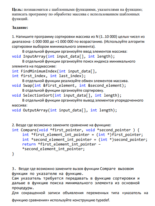3. Везде где возможно замените вызов функции Compare вызовом функции по указателю на функцию. Сам указатель требуется передавать в функцию сортировки и дальше в функцию поиска минимального элемента из основной процедуры. Для сокращенной записи объявления переменных типа «указатель на функцию сравнения» используйте конструкцию typedef.